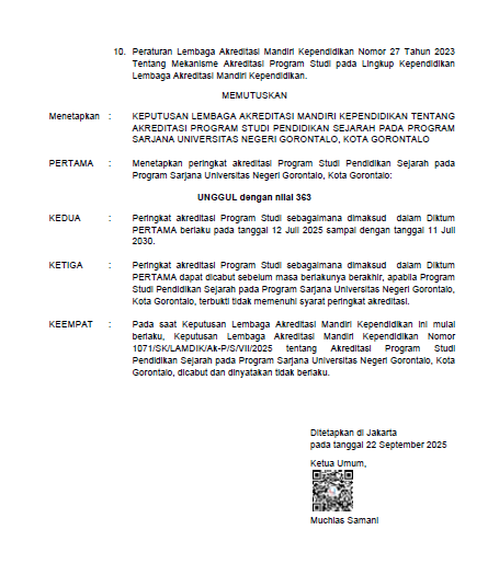 Akreditasi Unggul menjadi pengakuan bahwa Jurusan Sejarah UNG telah memenuhi standar pendidikan tinggi terbaik, baik dari aspek kurikulum, kualitas pengajaran, penelitian, publikasi ilmiah, hingga pengabdian kepada masyarakat. Tidak hanya itu, fasilitas pembelajaran dan atmosfer akademik yang kondusif juga menjadi faktor penting dalam penilaian LAMDIK.